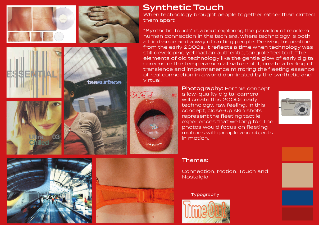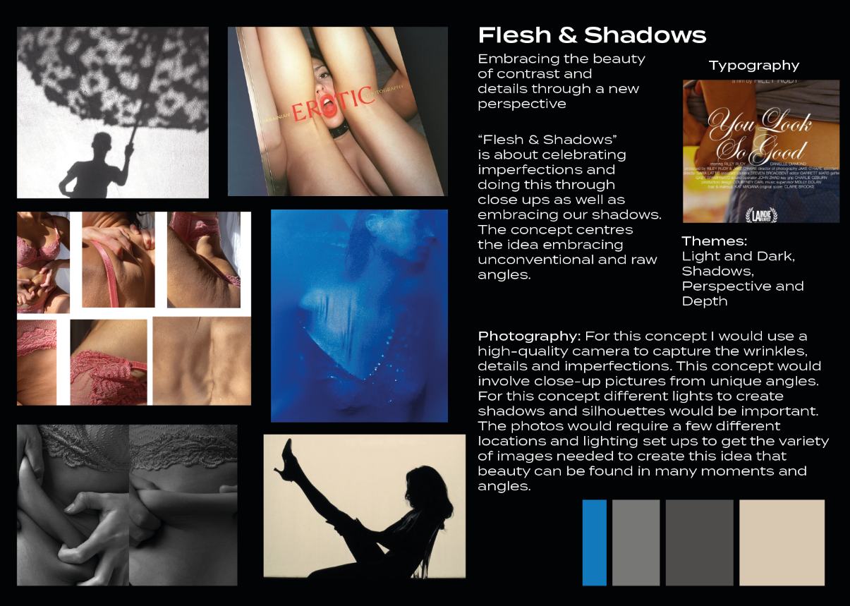 I initially developed “Synthetic Touch” and “Flesh & Shadows” as my concepts which then went on to be developed into my final concept of “Sheer & Shameless”. “Synethetic Touch” explores the nostalgia of early age technology and how it allowed for human connection rather than inhibited it. ‘Flesh & Shadows” delves into embracing imperfection as well as celebrating contrast in oneself as well as within lighting.